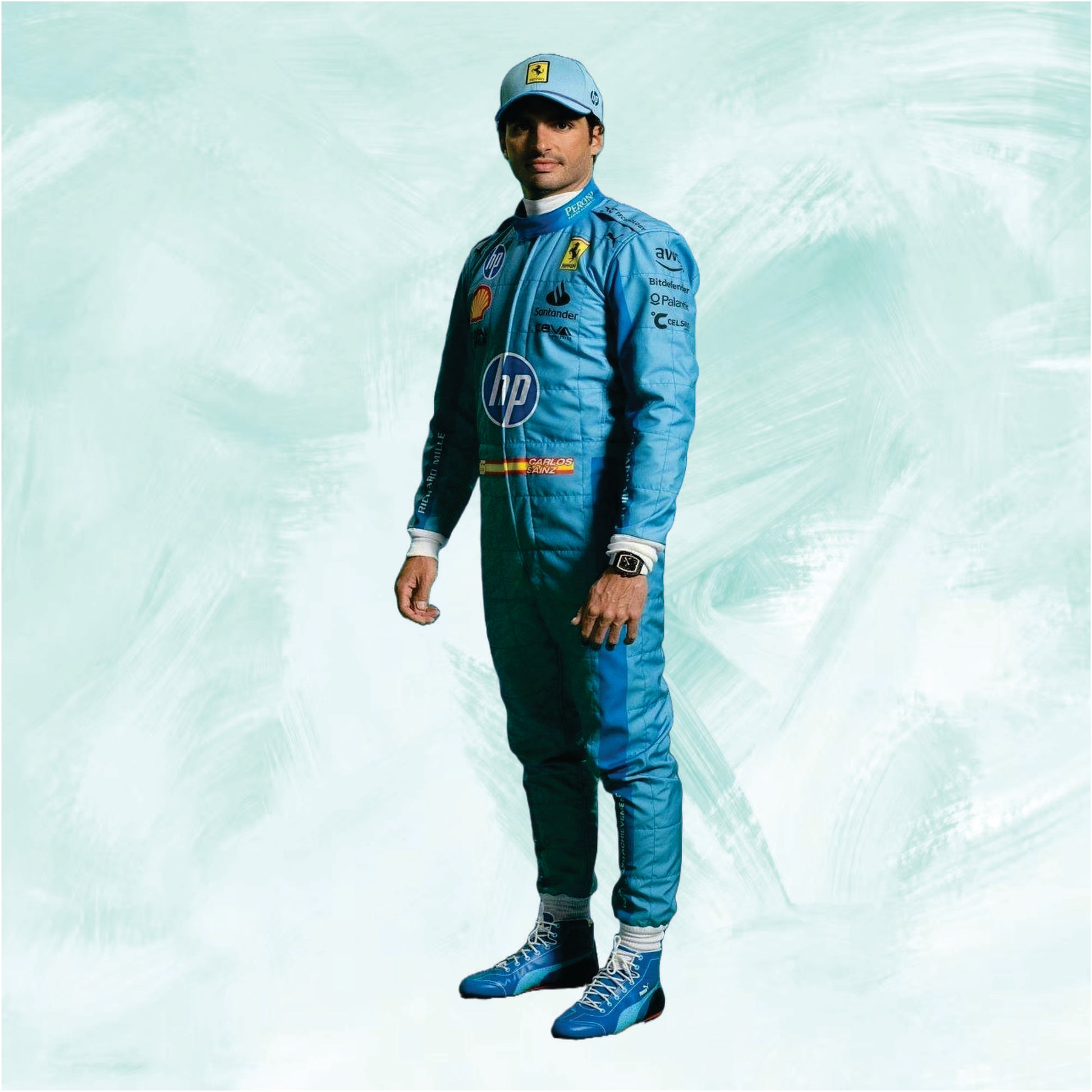 Miami GP Special Livery: The suit features a predominantly light blue (Azzurro La Plata) base with contrasting red and white accents. The blue color is a direct homage to historic Ferrari colors, giving the suit a distinctive retro feel.